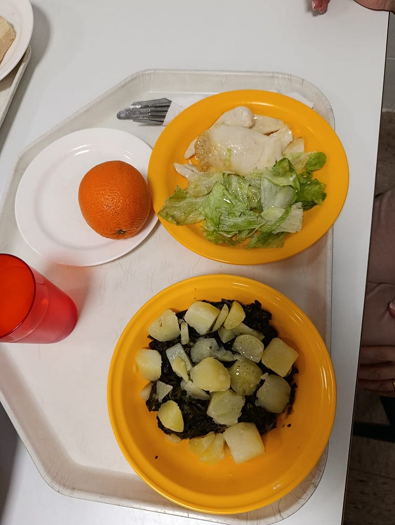 A mí, según me ha comentado la nutricionista del colegio, me ha tocado el menú “más duro” (léase menos atractivo) compuesto por acelgas con patatas hervidas, gallo (sin ni una espina ni piel) al horno con lechuga aliñada, de poste una naranja, pan blanco y/o integral, y agua, y os he de decir que estaba todo bien cocinado y servido a una temperatura perfecta. La presentación de los platos era la típica de colegio que no es demasiado atractiva, pero es lo que hemos vivido todos los que alguna vez o siempre nos hemos quedado a comer en el cole.