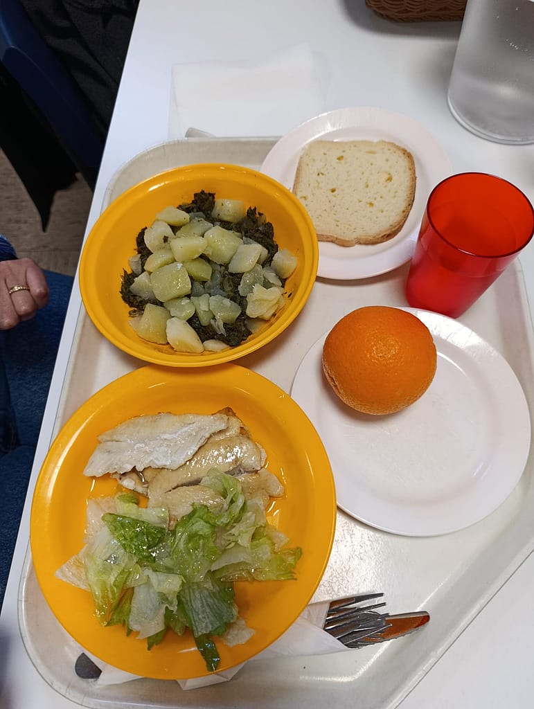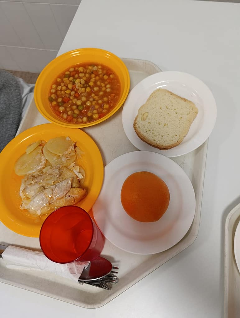 Nos comentaron también que desde la Generalitat, a partir de abril, comenzarán a introducir un día “vegano” y aumentará el consumo de legumbres. Justamente hoy había garbanzos y estaban bien de sabor, nada duros y tibios. También había pescado, blando, sin ninguna espina y con un sabor agradable.